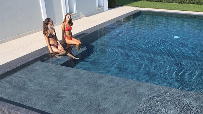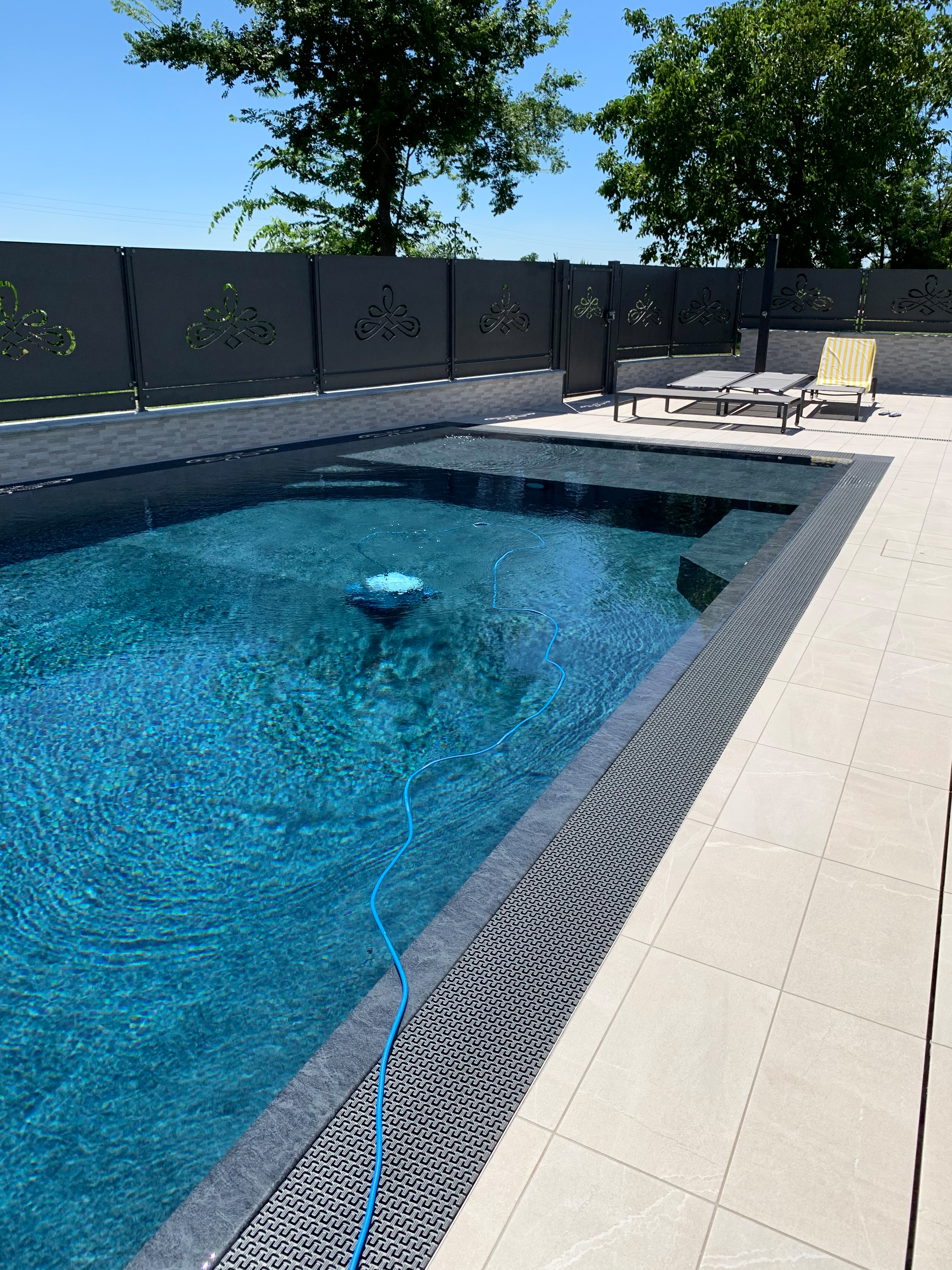 La griglia dello sfioro, come la superficie della piscina esterna, sono di color grigio scuro, mentre le piastrelle sono di color crema, in modo da armonizzare con il resto della casa e con il giardino.