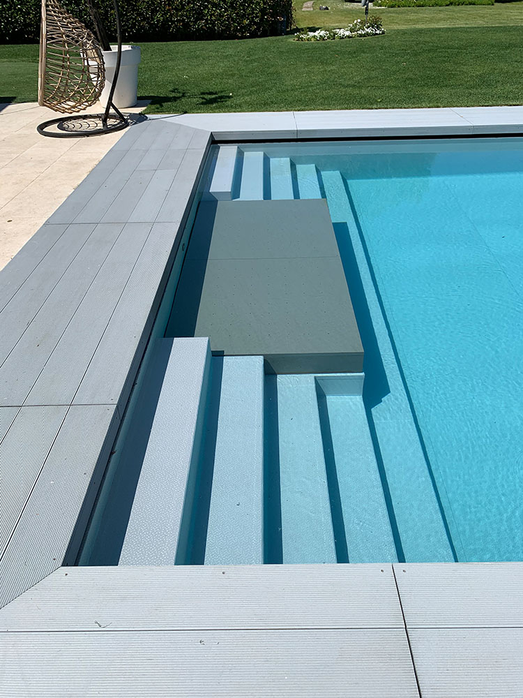 Oltre ai vantaggi dal lato estetico, questa soluzione ci permette di sfruttare a pieno lo spazio circostante alla vasca, permettendoci di sbizzarrirci con l’arredo piscina e creando una zona dedicata al comfort e al relax.