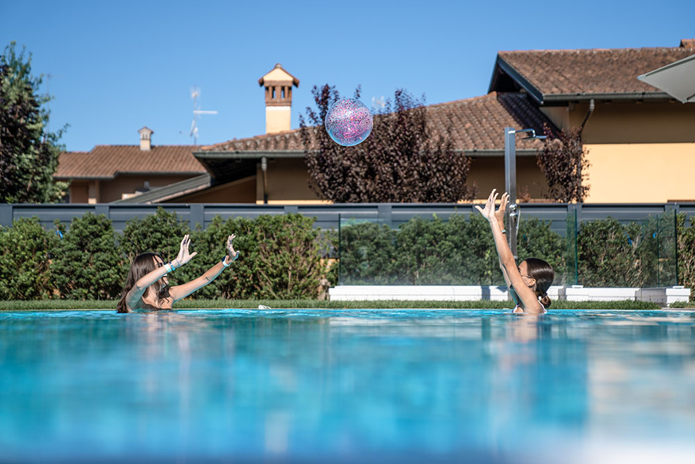 La piscina è composta da due vasche interconnesse: una vasca più piccola, con una scala per la discesa nella vasca e una zona poco profonda per rilassarsi nell’acqua e una vasca più grande, profonda 1,5 m, per nuotare e divertirsi.