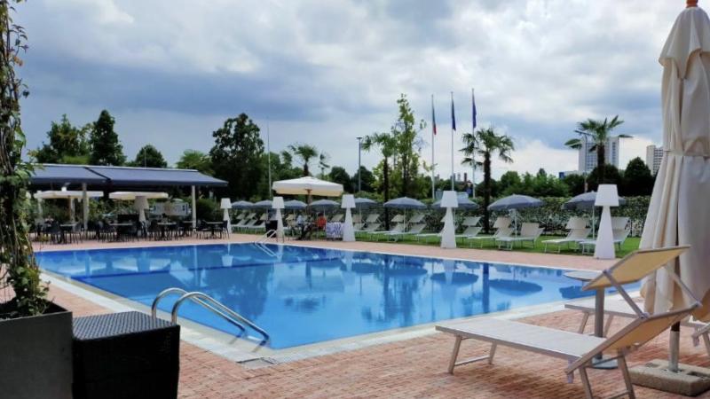 La piscina è stata costruita interrata e a sfioro, per garantire la salubrità dell'acqua e la bellezza del terrazzo. È stato utilizzato un pavimento in gres antiscivolo, per garantire la sicurezza degli ospiti, e sono stati scelti sdraio e ombrelloni in linea con l'arredamento interno dell'hotel.