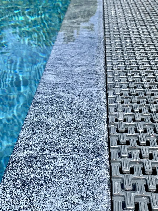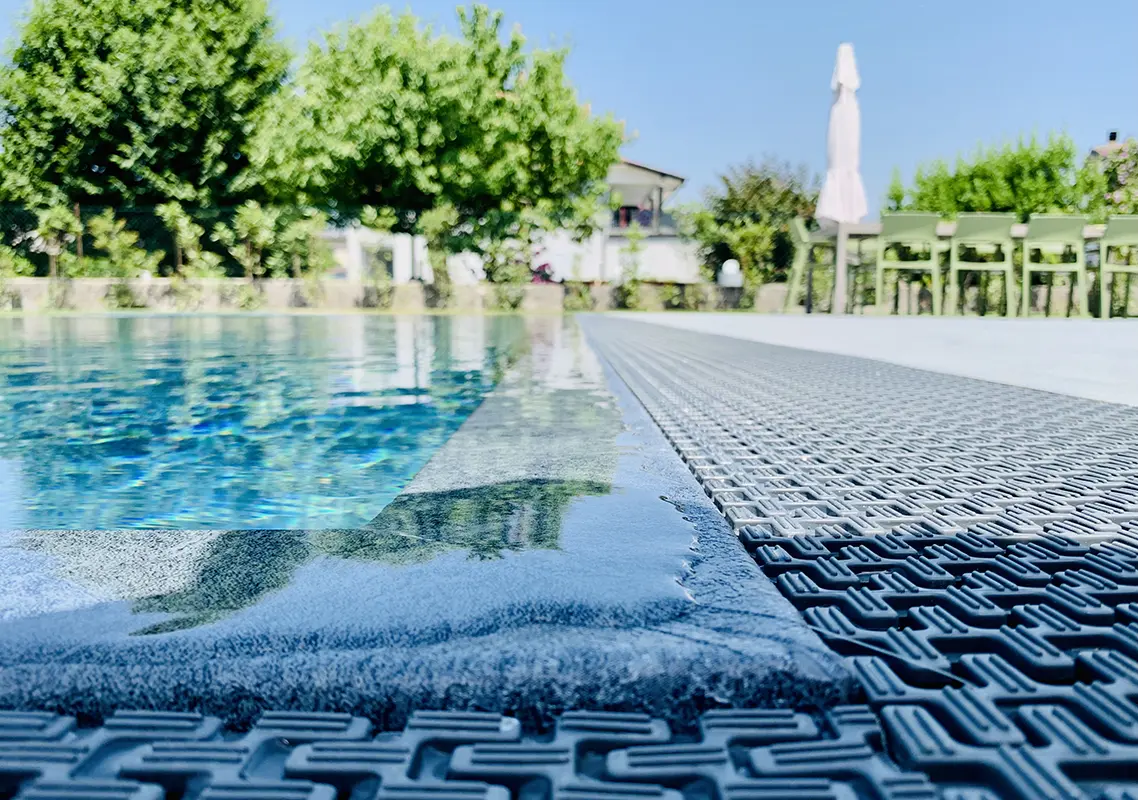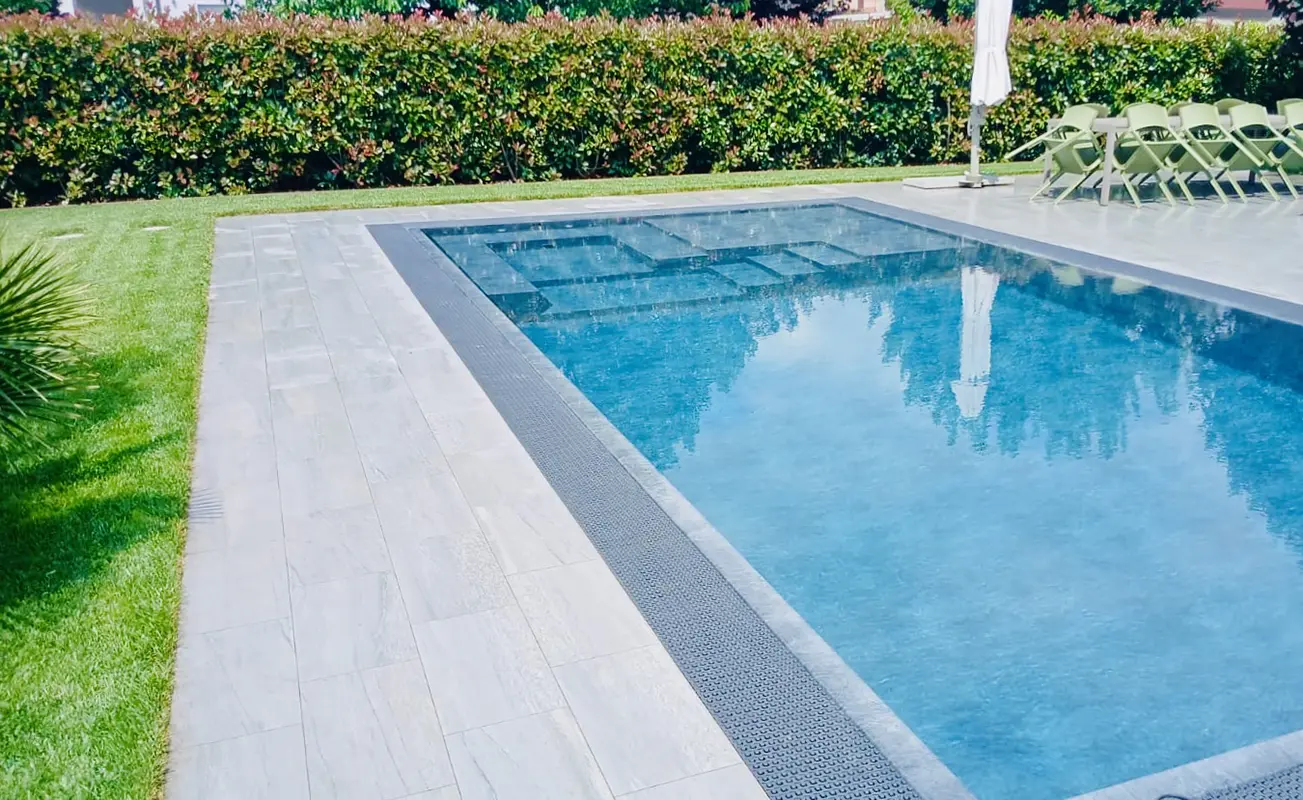 Il bordo della piscina a sfioro, crea un effetto visivo elegante e uniforme, in armonia con il pavimento in gres grigio chiaro che circonda la vasca. Grazie a un locale tecnico progettato con cura, l’acqua mantiene sempre un’eccellente qualità, per una piscina bella da vedere e confortevole da vivere ogni giorno.