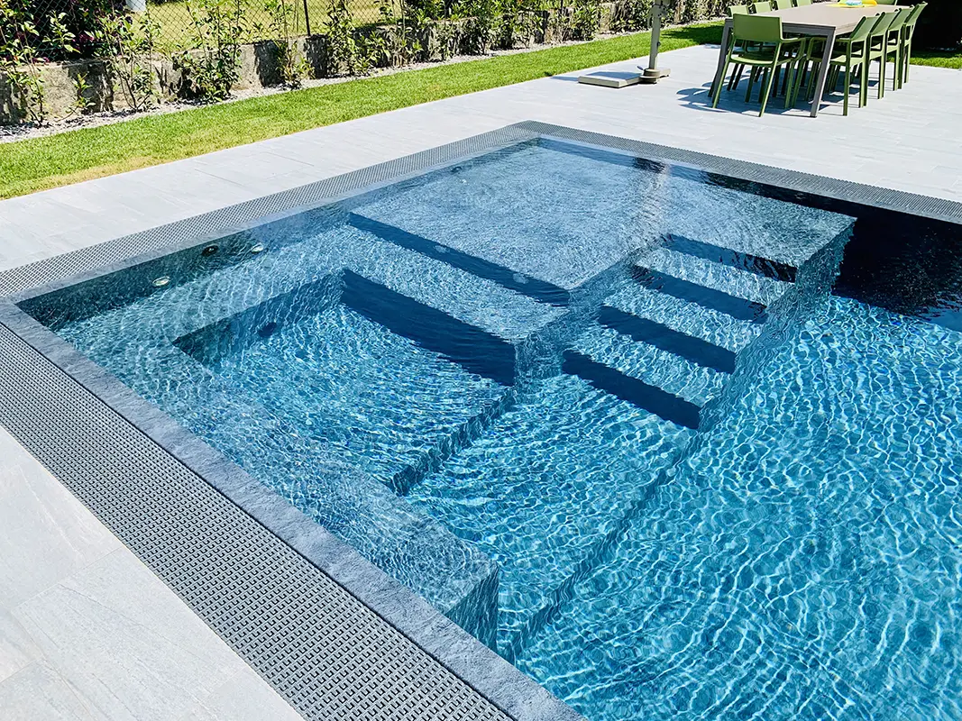 L’ingresso è facilitato da una scala interna collocata su uno degli angoli della vasca, perfettamente integrata nel design.